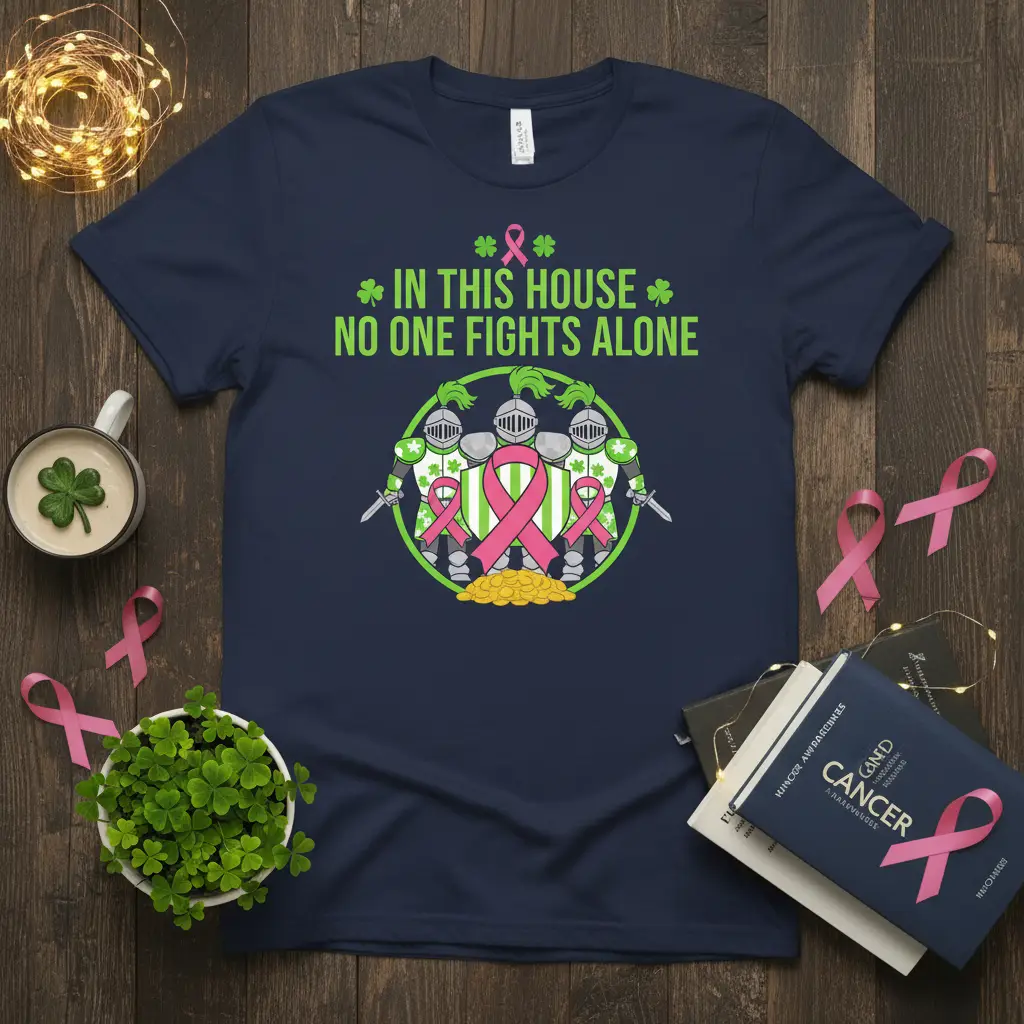In this house no one fights alone, a sentiment that resonates deeply with those touched by cancer and their loved ones. This powerful message is beautifully captured on our premium t-shirt, designed to be a beacon of hope and solidarity. The striking graphic features three valiant knights standing guard, symbolizing courage and protection, surrounding a vibrant pink ribbon, the universal emblem of breast cancer awareness. This tee is more than just apparel; it’s a statement of unity, strength, and unwavering support for anyone on their cancer journey.