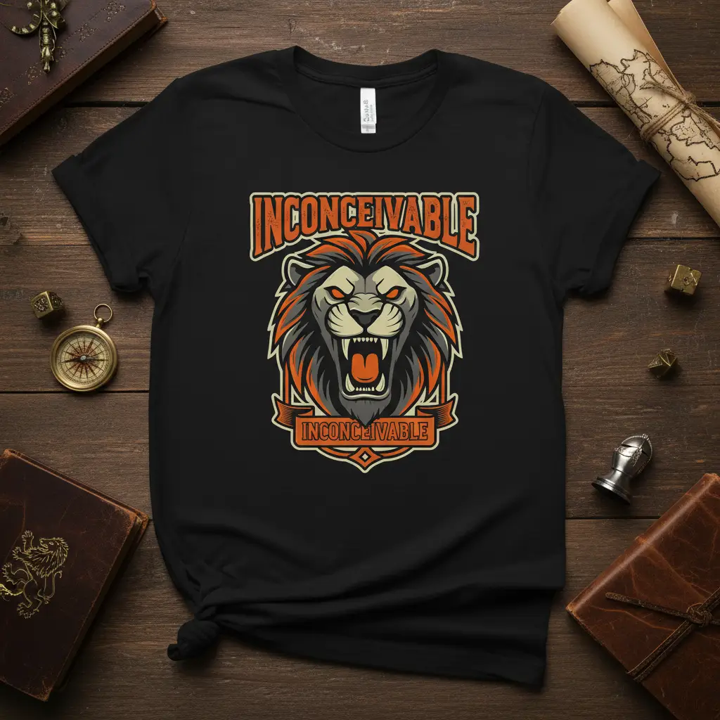 This eye-catching graphic tee prominently features a magnificent roaring lion, its mane a fiery blend of orange and dark grey, with piercing orange eyes that convey intense focus. The word “INCONCEIVABLE” is emblazoned above the lion’s head in a dynamic, stylized font, echoing the untamed energy of the beast. Below the lion, the same word is repeated on a banner, reinforcing the powerful message. This design captures the essence of fierce animal art, making it a compelling choice for anyone who admires the power and symbolism of lions.