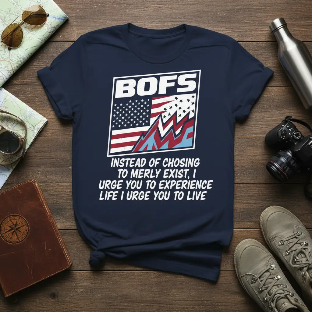 This t-shirt is a testament to the belief that life is meant to be experienced, not just endured. The design features the prominent “BOFS” logo, signifying a community or mindset dedicated to living life to its absolute fullest. Below it, a dynamic graphic blends the American flag with mountain peaks, symbolizing freedom, exploration, and the pursuit of personal summits. It’s an apparel choice for the bold, the brave, and the curious at heart.
