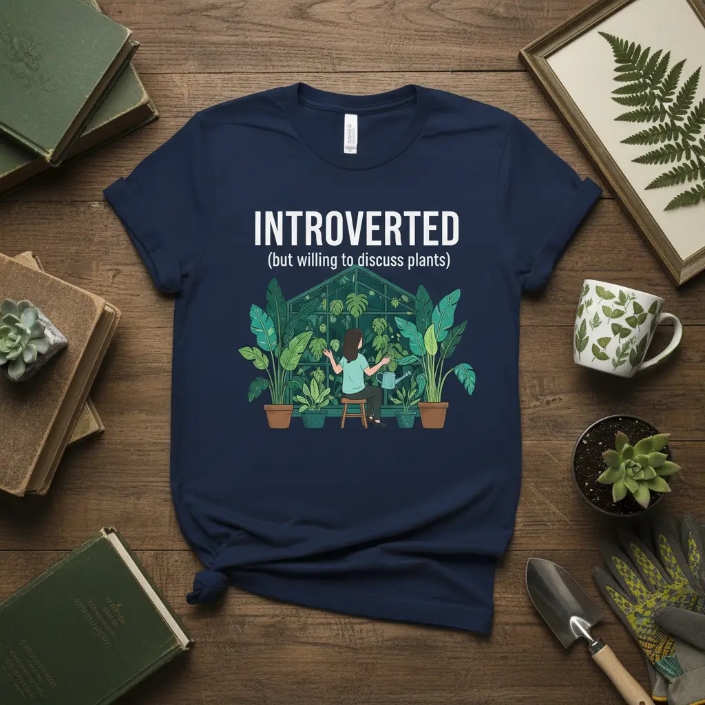 Pick from Black, Navy, Royal, Dark Heather, Red, and White to match your mood and wardrobe staples. Each colorway keeps the INTROVERTED but willing to discuss plants design clear and photo-ready for everyday wear.