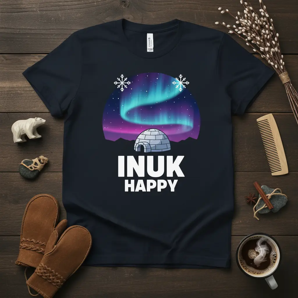 This t-shirt is a celebration of arctic life and the breathtaking aurora borealis. The design features bold white lettering spelling out “INUK HAPPY,” placed beneath a vibrant depiction of the Northern Lights dancing across a starry sky. An igloo sits peacefully in the foreground, symbolizing warmth and shelter amidst the stunning natural spectacle. It’s a wearable piece of art that evokes feelings of joy, wonder, and a deep appreciation for the unique culture and environment of the Arctic.