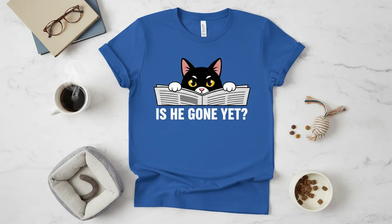 IS HE GONE YET? This question resonates with every cat owner who has ever wondered about their feline’s inner thoughts and silent observations. This t-shirt design perfectly encapsulates that common, humorous sentiment, featuring a charming black cat engrossed in a newspaper. It’s more than just apparel; it’s a statement piece that speaks to the unique bond and understanding between humans and their cats. The design is crafted to bring a smile to your face and spark conversations with fellow cat lovers.