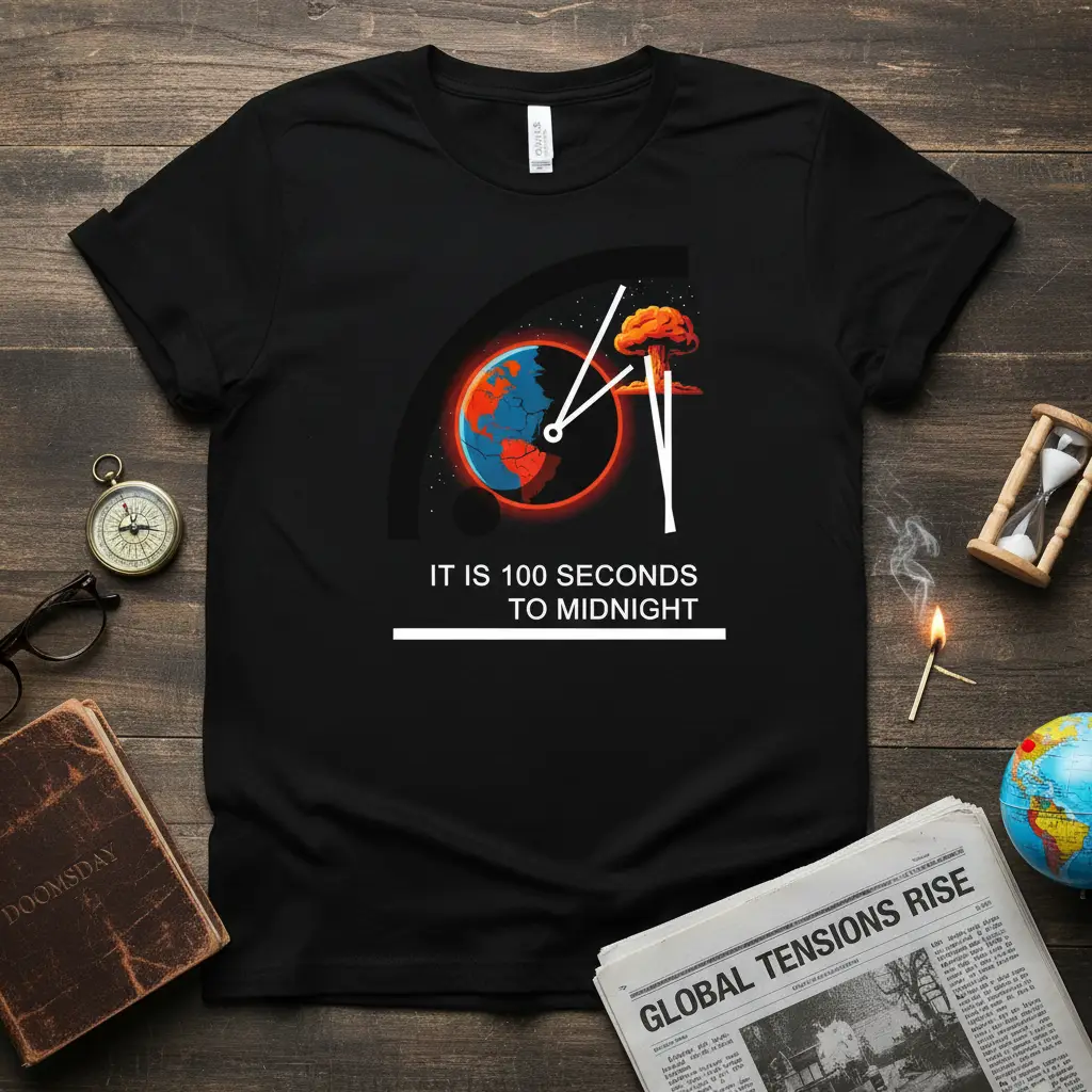 The “It Is 100 Seconds To Midnight” t-shirt is designed to be a catalyst for change, encouraging dialogue and raising awareness about the most pressing global challenges. Its striking visual and urgent message make it a powerful tool for advocacy and a unique addition to any wardrobe. This tee is perfect for rallies, educational events, or simply as a daily reminder to stay informed and engaged. Don’t just stand by; wear your concern and be a part of the movement for a safer, more sustainable world. Order yours today and make your voice heard!