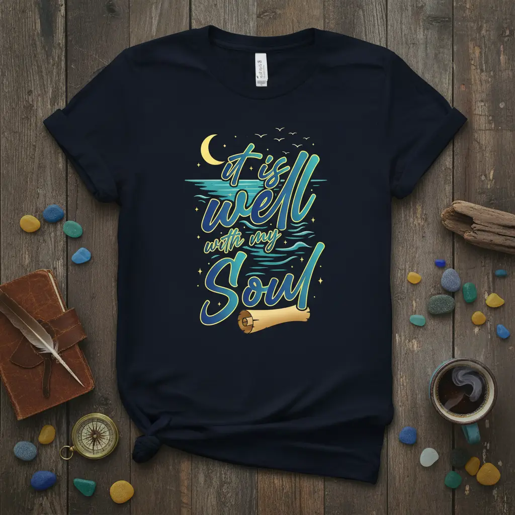 It is well with my Soul, a message of profound peace and unwavering faith, is beautifully captured on this comfortable and stylish t-shirt. This garment is more than just apparel; it’s a wearable affirmation designed to bring comfort and inspiration to your everyday life. The serene design, featuring a tranquil moonlit seascape, evokes a sense of calm and spiritual grounding. It’s perfect for anyone seeking to express their devotion and inner peace through their clothing. Let this tee be a gentle reminder of the steadfast reassurance that all is well. Embrace the message and share its uplifting spirit with the world.