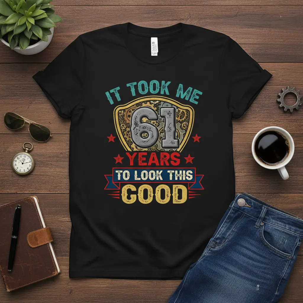 IT TOOK ME 61 YEARS TO LOOK THIS GOOD – this statement t-shirt is the ultimate way to celebrate a milestone birthday and embrace your journey with humor and style. It’s more than just a piece of apparel; it’s a declaration of wisdom, experience, and enduring charm. Perfect for anyone who appreciates a good laugh and wants to showcase their pride in reaching the age of 61 with grace and a touch of retro flair. This design captures the essence of aging gracefully while still looking fantastic.