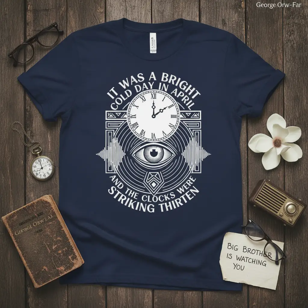 It Was A Bright Cold Day In April And The Clocks Were Striking Thirteen, a phrase that echoes through the halls of dystopian literature, is now emblazoned on this striking navy t-shirt. This iconic quote from George Orwell’s masterpiece serves as a chilling reminder of unsettling realities and the power of language. It’s more than just a t-shirt; it’s a wearable piece of literary history, designed for those who appreciate the depth and impact of classic novels. The design features a stylized eye and a clock face, symbolizing surveillance and the distortion of time, perfectly complementing the quote’s ominous tone.
