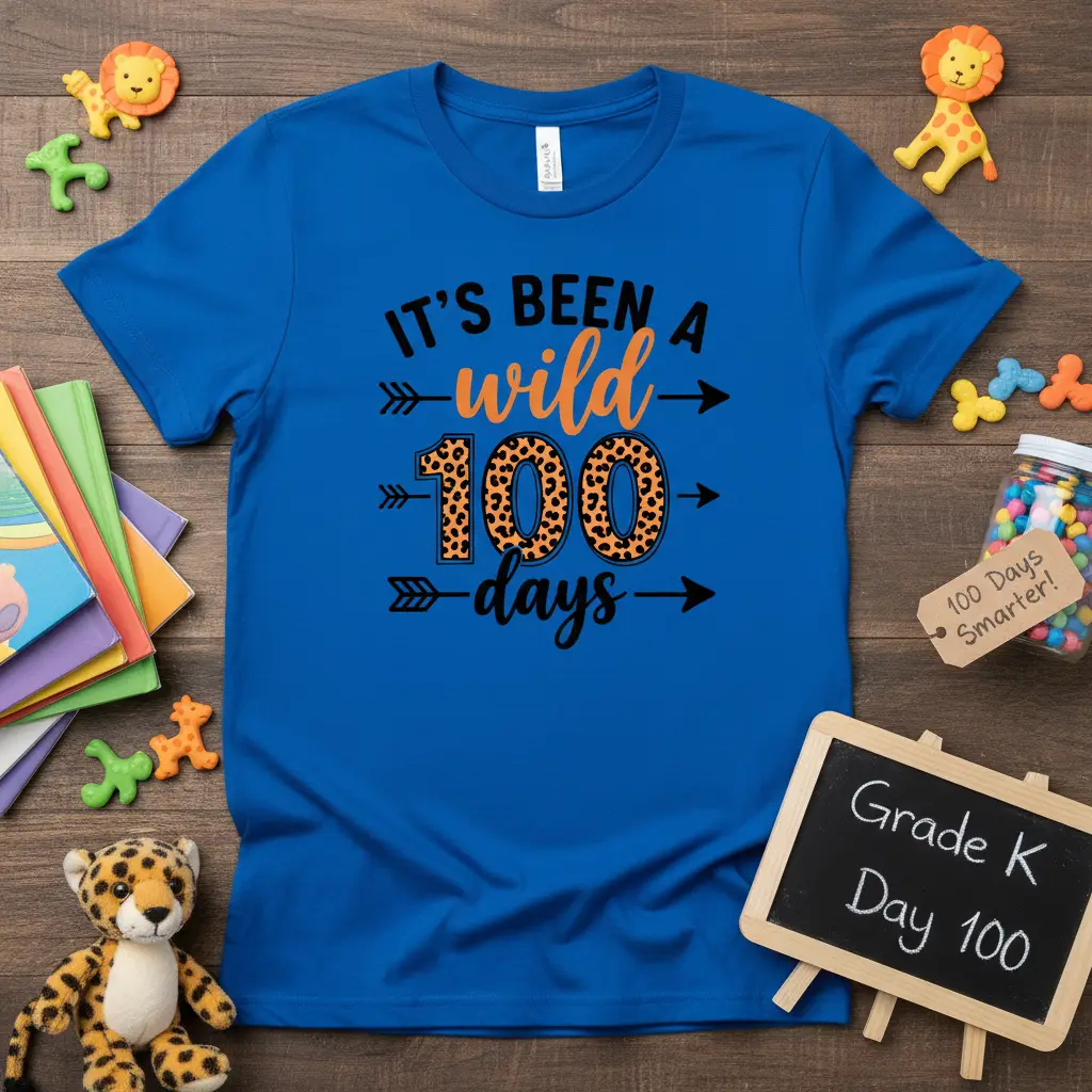 Pick from Black, Navy, Royal, Dark Heather, Red, and White to match your mood and wardrobe staples. Each colorway keeps the It’s Been A Wild 100 Days design clear and photo-ready for everyday wear.