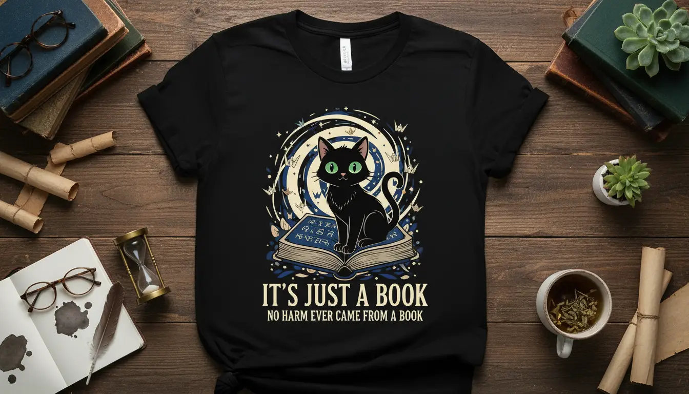 IT’S JUST A BOOK NO HARM EVER CAME FROM A BOOK. This captivating t-shirt design celebrates the profound connection between literature and our feline friends. It features an adorable black cat perched regally on an open book, surrounded by a mystical swirl of stars and paper cranes. The quote itself is a gentle reminder of the boundless worlds and harmless adventures that await within the pages of a good book, making it a perfect statement piece for any avid reader.