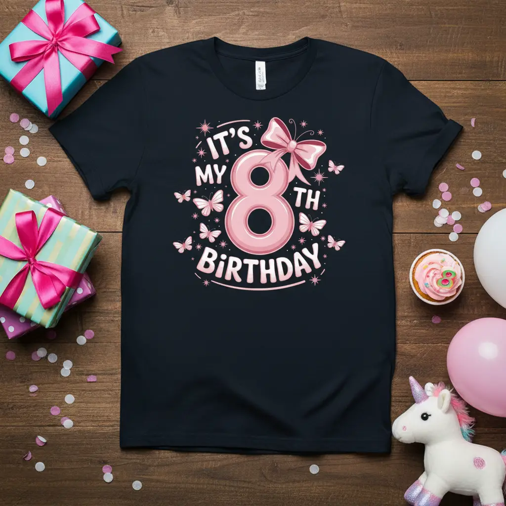 It’s My 8th Birthday! This special t-shirt is designed to make any eight-year-old girl feel like the queen of her own celebration. Featuring a delightful combination of playful typography, a charming pink bow, and whimsical butterflies, this shirt is perfect for capturing the magic of her big day. It’s more than just apparel; it’s a wearable memory for a milestone birthday. The vibrant design ensures she’ll stand out and feel celebrated from the moment she puts it on.