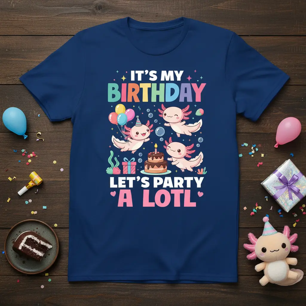 The “LET’S PARTY ‘A LOTL'” slogan is the heart of this design, offering a playful and memorable twist on traditional birthday greetings. It’s a conversation starter and a declaration of fun, perfectly suited for those who love to celebrate with enthusiasm and a touch of humor. The inclusion of the axolotl theme adds an extra layer of charm and personality, making this shirt a standout piece for any birthday celebration.