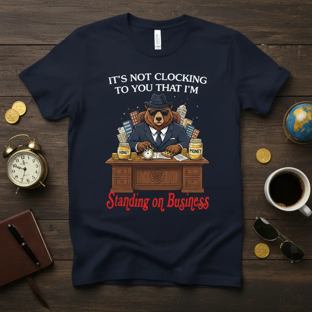 IT’S NOT CLOCKING TO YOU THAT I’M Standing on Business, this statement tee perfectly captures the relentless spirit of entrepreneurs, investors, and anyone who lives and breathes their work. The design features a sharp-dressed bear, embodying success and ambition, seated at a desk piled high with jars of “HONEY” and currency, set against a vibrant cityscape. It’s a humorous yet powerful declaration that for some, the hustle never stops, and dedication is the ultimate currency.