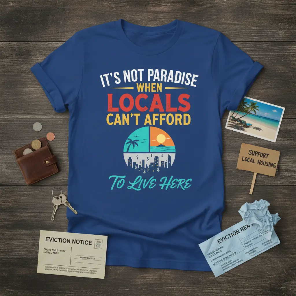 It’s Not Paradise When Locals Can’t Afford To Live Here, this t-shirt is more than just apparel; it’s a powerful statement piece for social justice advocates and anyone concerned about the growing housing crisis. It directly addresses the issue of gentrification and the displacement of long-term residents from their communities. The design encapsulates the struggle many face when the very places they call home become unaffordable, transforming idyllic locations into symbols of economic inequality. This shirt is designed to spark conversations and raise awareness about the urgent need for accessible and affordable housing for all. Wear your message proudly and advocate for change.