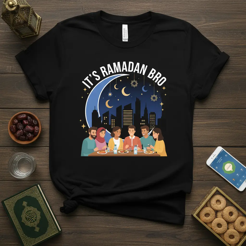 The graphic elements on the “It’s Ramadan Bro” t-shirt are carefully chosen to represent key aspects of Ramadan. The crescent moon and stars are classic Islamic symbols, while the cityscape adds a contemporary touch, making the design relevant to modern observers. The inclusion of people sharing a meal highlights the importance of Iftar, the evening meal that breaks the day’s fast, and Suhoor, the pre-dawn meal. This thoughtful combination creates a design that is both culturally significant and visually appealing, resonating with the values and traditions of Ramadan.