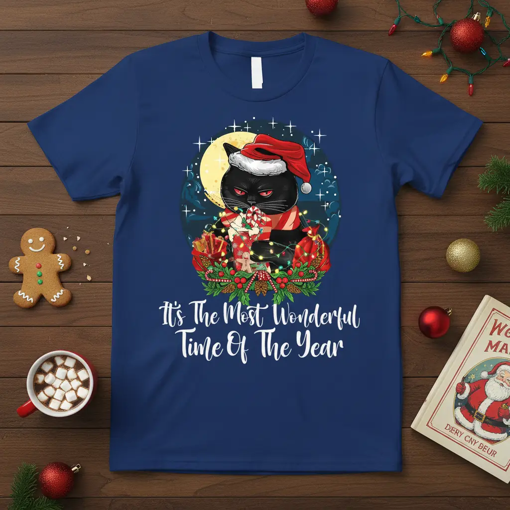 It’s The Most Wonderful Time Of The Year with this incredibly festive and fun t-shirt design. This unique graphic features a mischievous black cat, decked out in a Santa hat and a cozy scarf, ready to spread some holiday cheer. Surrounded by twinkling Christmas lights, wrapped gifts, and sweet candy canes, the design perfectly captures the magical essence of the holiday season. It’s an ideal way for cat lovers and anyone who adores Christmas to express their festive spirit and sense of humor.