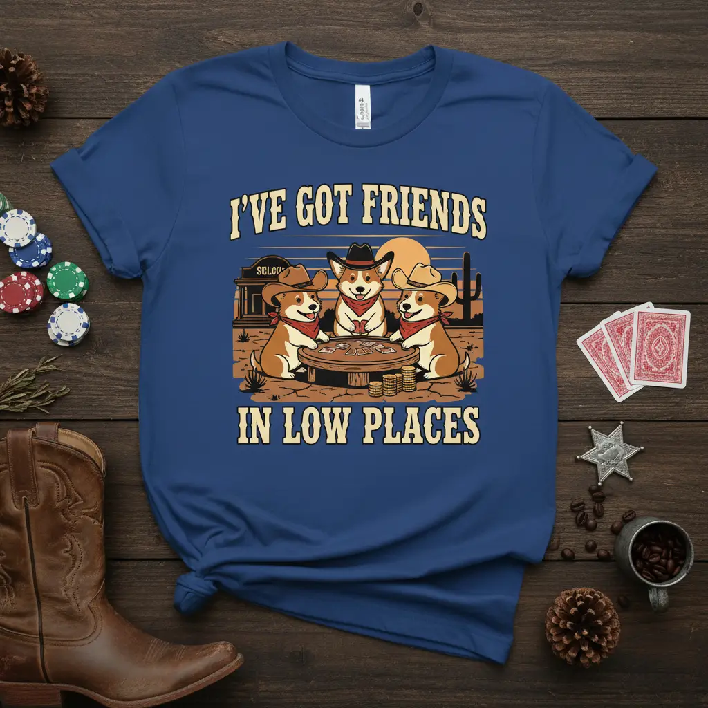 The phrase “I’ve Got Friends In Low Places” takes on a new, delightful meaning when paired with these charming canine card sharks. It suggests a shared experience, a secret world of fun and fellowship that only true friends understand. This design is a celebration of loyalty, good times, and the simple joys of life, all wrapped up in a comfortable and stylish t-shirt. It’s an ideal gift for anyone who loves corgis, enjoys card games, or appreciates a good dose of Western-themed humor.
