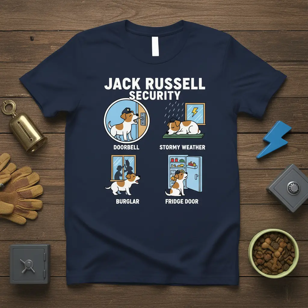 Celebrate the unique “security” tactics of your Jack Russell with this funny and relatable t-shirt. It humorously depicts various scenarios, from the doorbell to the fridge door, highlighting your dog’s adorable vigilance. This comfortable tee is a must-have for any proud Jack Russell owner or a fantastic gift for fellow dog enthusiasts.