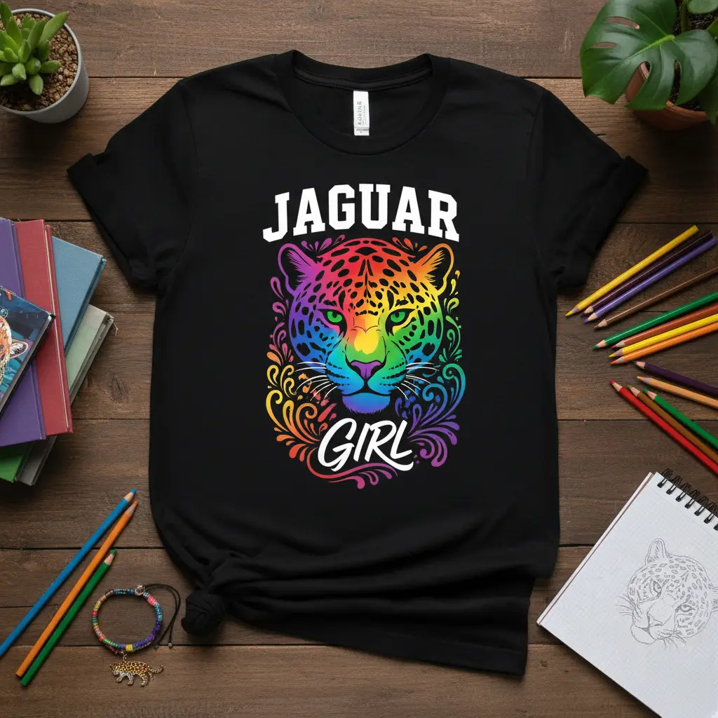 The core of this design is the powerful imagery of the Jaguar Girl, symbolizing strength, grace, and a vibrant spirit. The rainbow color palette brings an unexpected and joyful dimension to the majestic jaguar, creating a look that is both fierce and fashionable. This t-shirt is perfect for anyone who feels a connection to the wild and wants to wear their appreciation for these incredible creatures proudly.