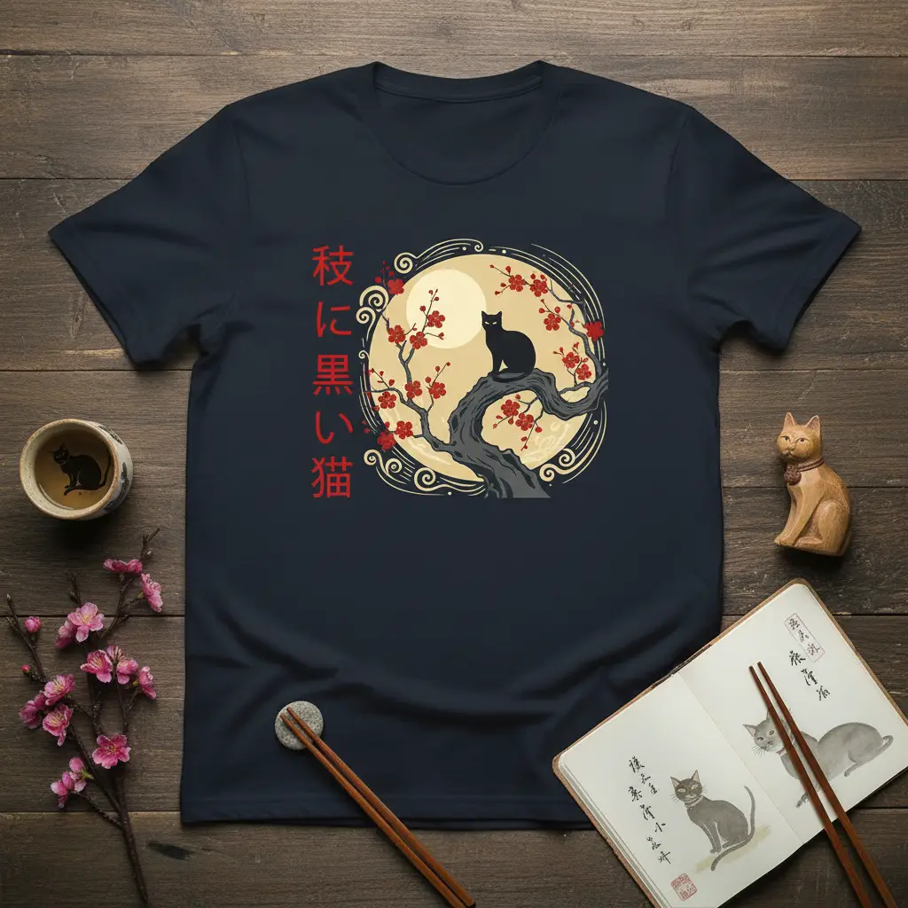 The visual storytelling of the design invites viewers to imagine the quiet night, the gentle breeze rustling the sakura petals, and the watchful gaze of the black cat. It’s an invitation to appreciate the subtle beauty that surrounds us, often found in the quiet moments and the grace of nature’s creatures. This t-shirt is a reminder to slow down, observe, and find beauty in the details, much like the artistry embedded in the 枝に黒い猫 motif itself.
