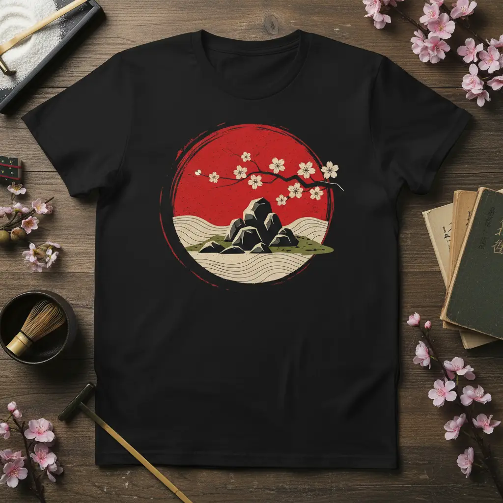 This unique t-shirt showcases a beautifully rendered Japanese landscape, evoking a sense of peace and natural harmony. The bold red sun, a common symbol in Japanese art, serves as a vibrant focal point. Surrounding it, the textured rocks and gentle cherry blossoms create a delicate contrast, embodying the transient beauty of nature.