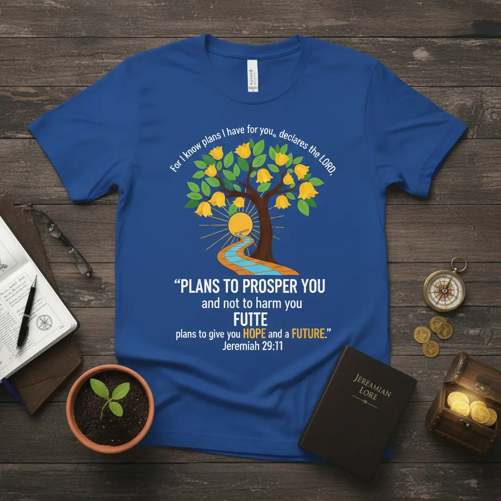 The phrase “PLANS TO PROSPER YOU” is central to the message, emphasizing God’s benevolent intentions. Coupled with “HOPE and a FUTURE,” it paints a picture of a life filled with purpose and divine assurance. This shirt is ideal for anyone looking to express their spiritual convictions through their wardrobe. It’s a reminder that even in challenging times, there is a divine roadmap leading to a brighter tomorrow.