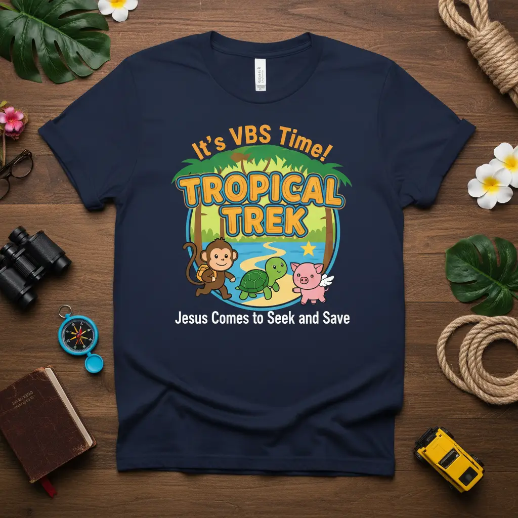 Jesus Comes to Seek and Save with this exciting Tropical Trek VBS T-Shirt! This shirt captures the spirit of adventure and faith, making it an ideal choice for Vacation Bible School participants and leaders. The vibrant design features playful cartoon animals embarking on a tropical journey, embodying the message of divine guidance and salvation. It’s more than just apparel; it’s a wearable reminder of the powerful lessons learned during VBS. Get ready to trek through faith with this inspiring tee.
