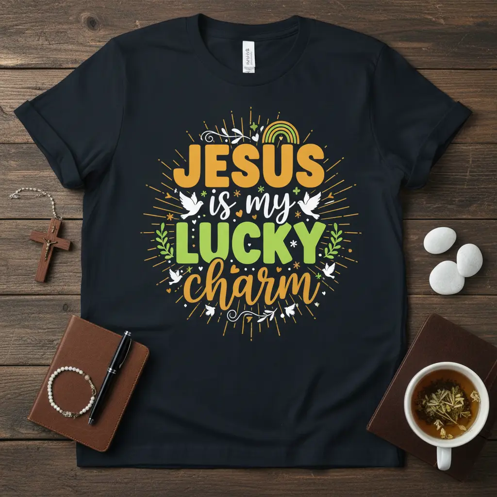 This Jesus is my Lucky Charm design is designed to resonate with anyone who finds their strength, joy, and good fortune through their relationship with Jesus. It’s a versatile piece that can be worn to church, casual gatherings, or simply as a personal affirmation of faith. The uplifting message and attractive design make it a cherished item for any Christian wardrobe.