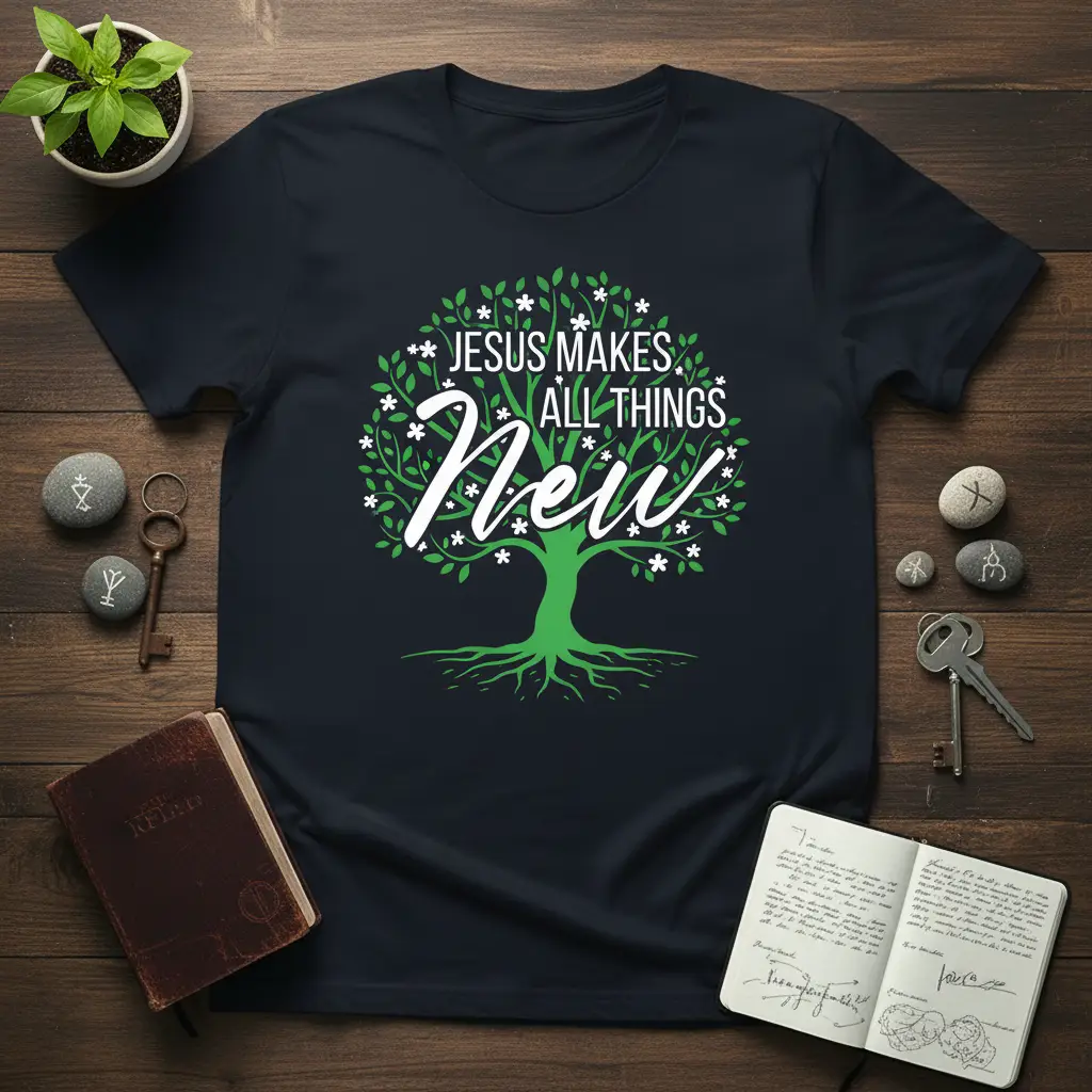 This tee proudly displays the uplifting message “Jesus Makes All Things New,” a cornerstone of Christian belief. The intricate green tree graphic, adorned with delicate white blossoms, visually represents the rebirth and fresh starts that faith in Jesus offers. It’s designed for those who wish to carry their spiritual convictions with them, sharing a message of hope and redemption through their everyday style.