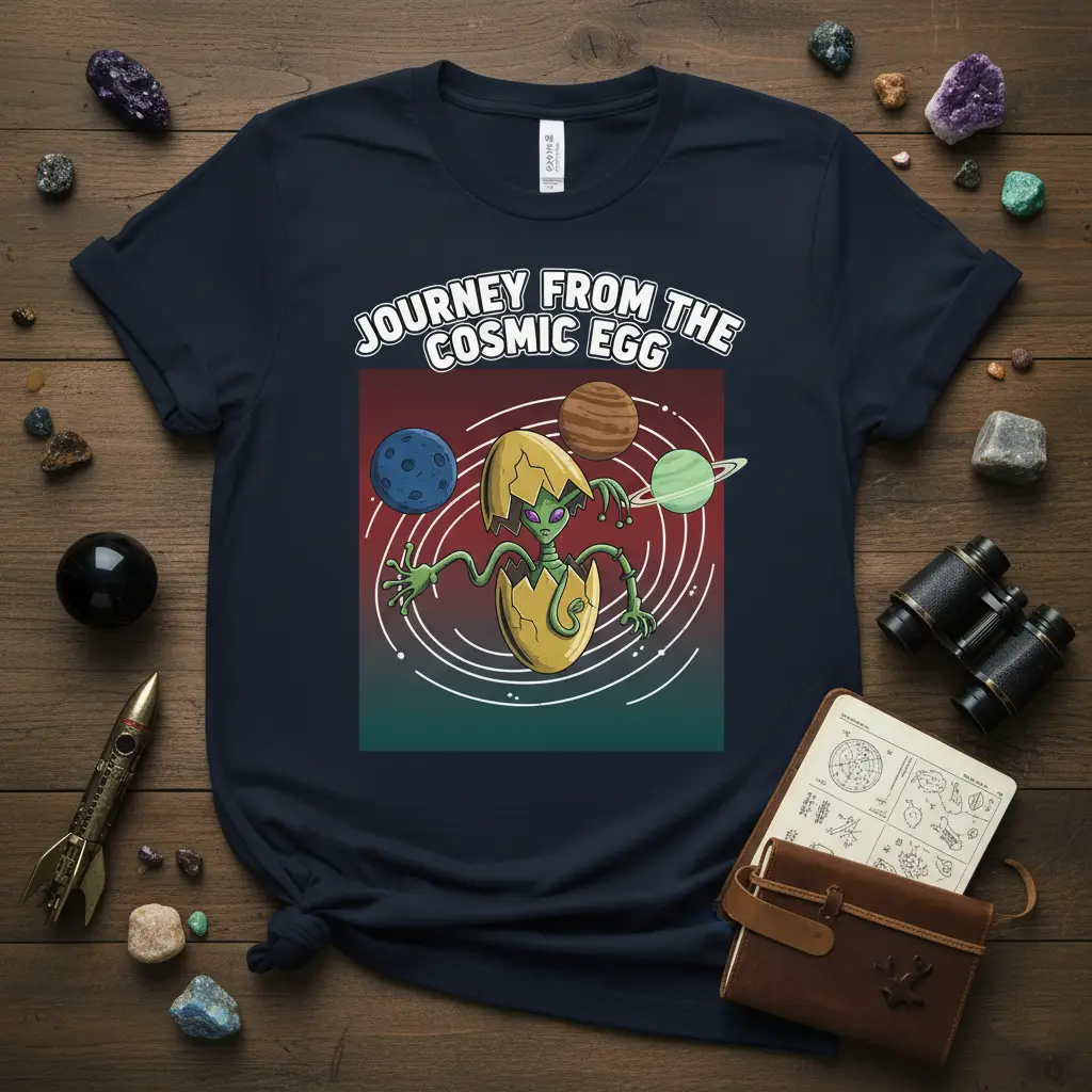 This “Journey From The Cosmic Egg” tee is designed for comfort and style, making it a versatile piece for any casual occasion. Its unique design is sure to stand out, appealing to those with a passion for all things cosmic and extraterrestrial. The vibrant colors and intricate details of the artwork are rendered with precision, ensuring a high-quality print that lasts. It’s an ideal garment for expressing your love for space and science fiction in a fun and engaging way.