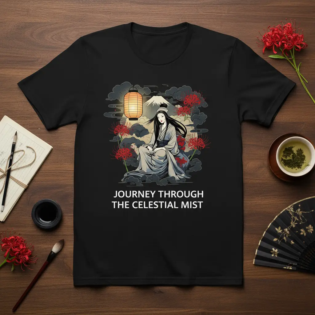 Journey Through The Celestial Mist captures the essence of serene beauty and profound cultural artistry. This t-shirt is more than just apparel; it’s a wearable piece of art that invites contemplation and admiration. The intricate design features a graceful woman in traditional Japanese attire, set against a backdrop that blends the iconic Mount Fuji with vibrant red spider lilies and a softly glowing lantern. This imagery evokes a sense of peace, mystery, and a journey into a mystical realm, perfect for anyone who appreciates the delicate balance of nature and tradition.