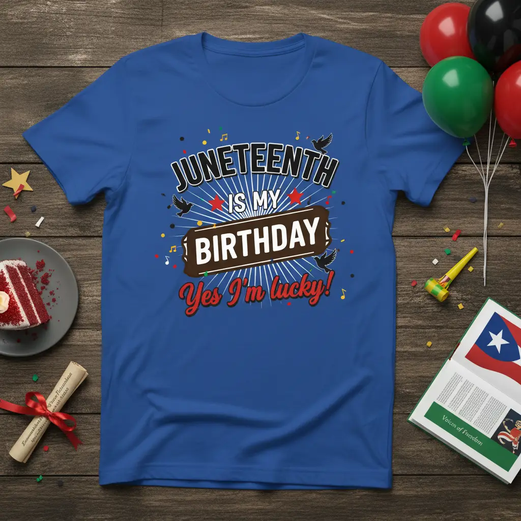 JUNETEENTH IS MY BIRTHDAY Yes I’m lucky! This vibrant and celebratory t-shirt is designed to commemorate Juneteenth with pride and joy. It’s the perfect way to express your heritage and celebrate the spirit of freedom on this significant day. The eye-catching design features bold typography and festive accents, making it a standout piece for any Juneteenth event or gathering. Wear your pride and celebrate the journey of liberation with this unique and meaningful garment.