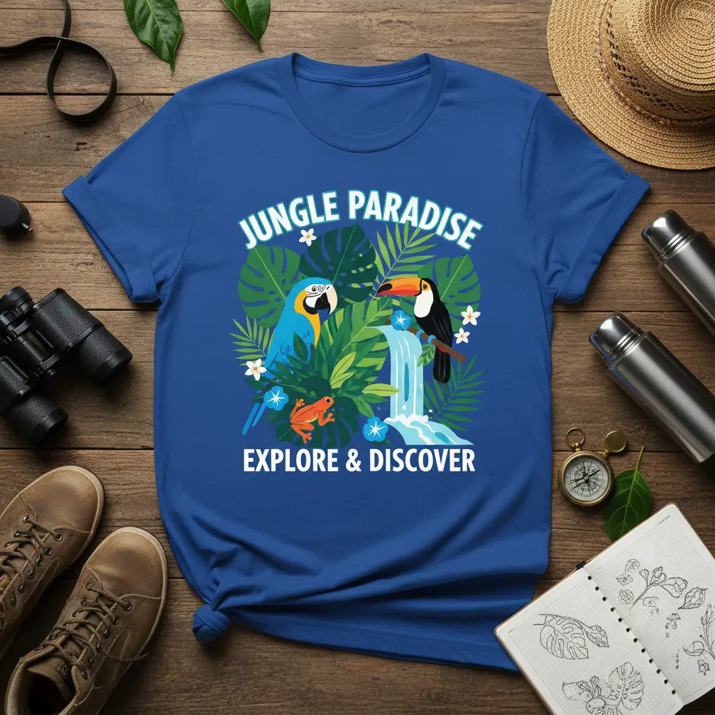 Step into a world of vibrant colors and exotic creatures with this captivating t-shirt. This JUNGLE PARADISE EXPLORE & DISCOVER design beautifully encapsulates the feeling of being surrounded by nature’s finest, from the majestic flight of colorful parrots to the striking presence of a toucan. It’s a visual journey into a serene jungle setting, complete with a cascading waterfall and lush, verdant foliage. This tee is perfect for anyone who dreams of tropical getaways or simply wants to bring a piece of paradise into their daily life.