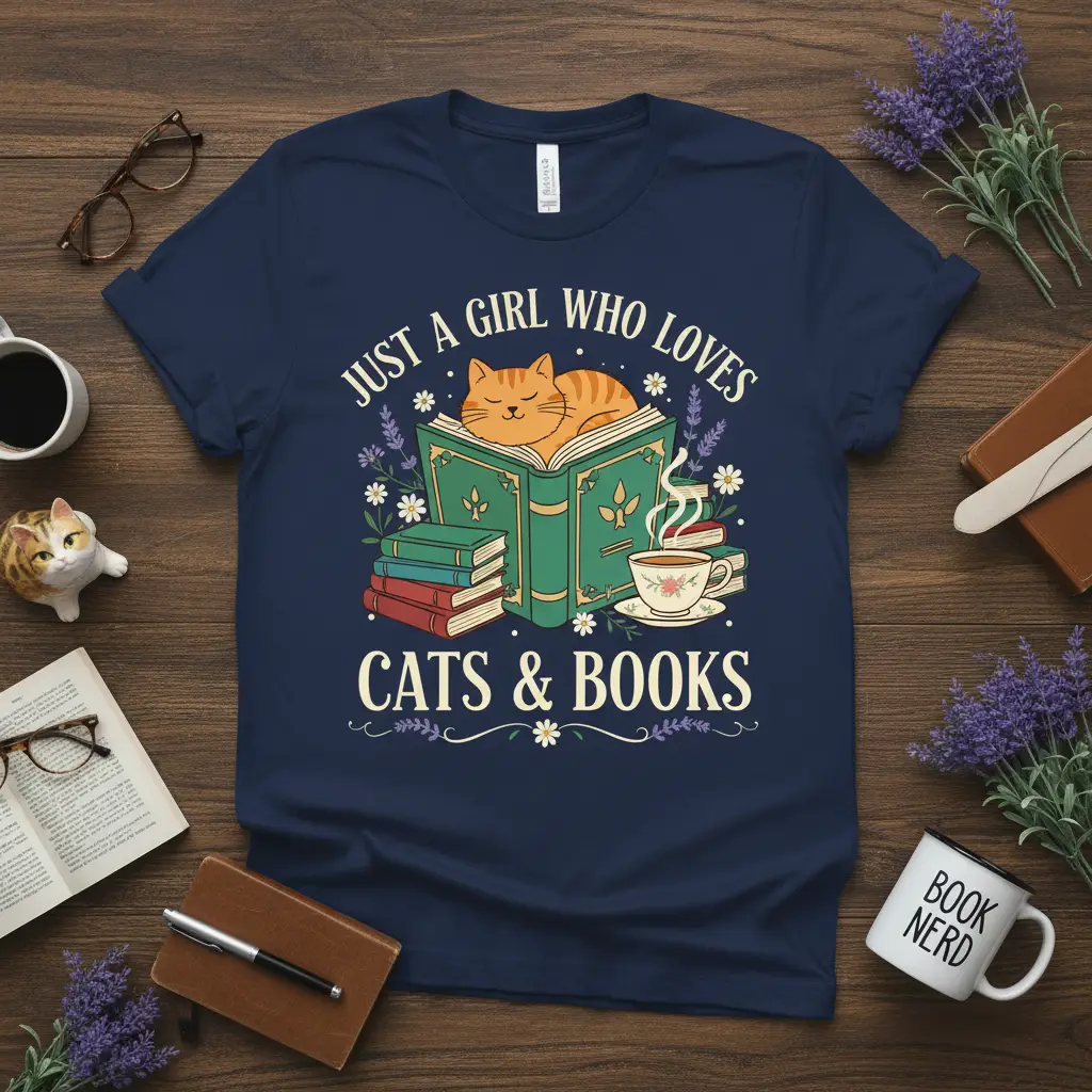 This delightful t-shirt features the heartwarming phrase “Just A Girl Who Loves Cats & Books,” artfully designed to resonate with every passionate reader and cat admirer. The central graphic showcases an adorable ginger cat peacefully napping atop an open book, creating a scene of ultimate tranquility. Delicate floral accents and sprigs of lavender surround the design, adding a touch of whimsical charm and evoking the serene atmosphere of a quiet reading nook.