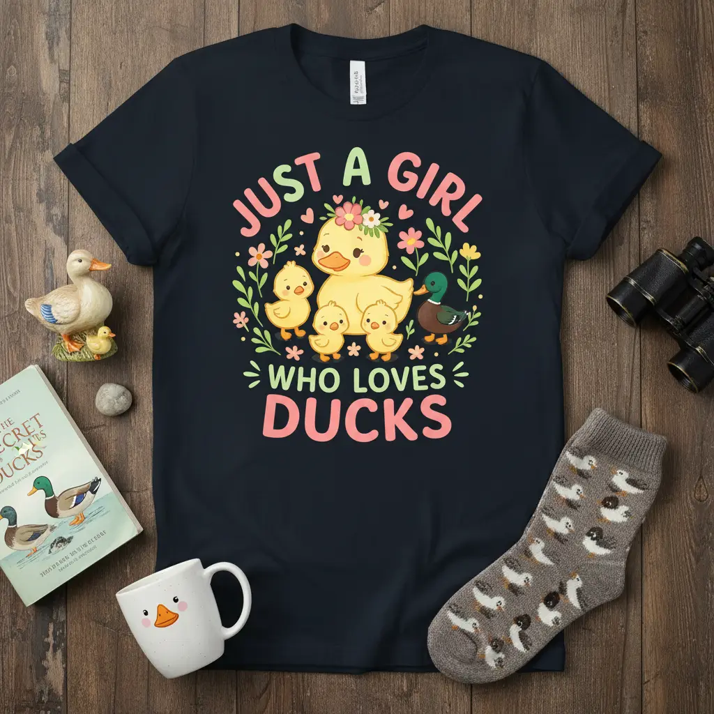 This JUST A GIRL WHO LOVES DUCKS design speaks to the heart of every duck lover, celebrating the simple pleasures and the undeniable charm of these feathered friends. It’s a wearable testament to a passion that brings smiles and a connection to the natural world. The artwork is detailed yet retains a cute, cartoonish appeal, making it suitable for all ages.