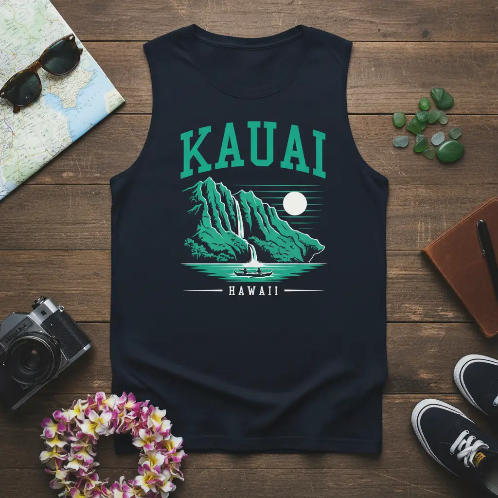 The striking visual on this tank top showcases a majestic waterfall tumbling down verdant cliffs into a calm body of water, with a solitary canoe gliding peacefully. A radiant moon hangs in the sky, completing the picturesque scene. This artistic representation is designed to resonate with anyone who has fallen in love with the natural splendor and adventurous allure of Kauai, Hawaii.