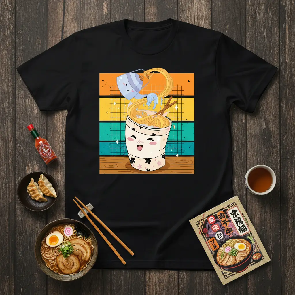 This charming graphic showcases a meticulously illustrated kawaii ramen cup, complete with wide, happy eyes and a playful blush. Noodles spill invitingly from the bowl, being poured from a smiling teapot, all accented by classic chopsticks. The vibrant, multi-colored striped background adds a retro flair, making the entire design pop with personality. It’s a visual treat that perfectly encapsulates the joy and comfort found in a delicious bowl of ramen, making it an ideal choice for fans of Japanese food and anime culture.