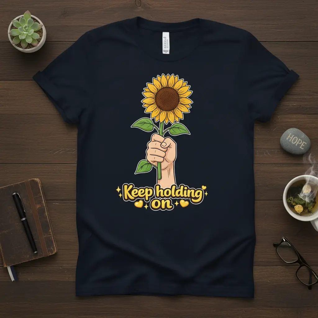 Keep holding on to hope and inner strength with this inspiring t-shirt, designed to be a constant reminder of your resilience. The captivating graphic features a hand firmly grasping a vibrant sunflower, symbolizing perseverance and the beauty found even in difficult times. This tee is more than just apparel; it’s a wearable affirmation, perfect for anyone navigating life’s ups and downs or celebrating their journey of self-discovery. It’s a thoughtful gift that speaks volumes about encouragement and unwavering spirit.
