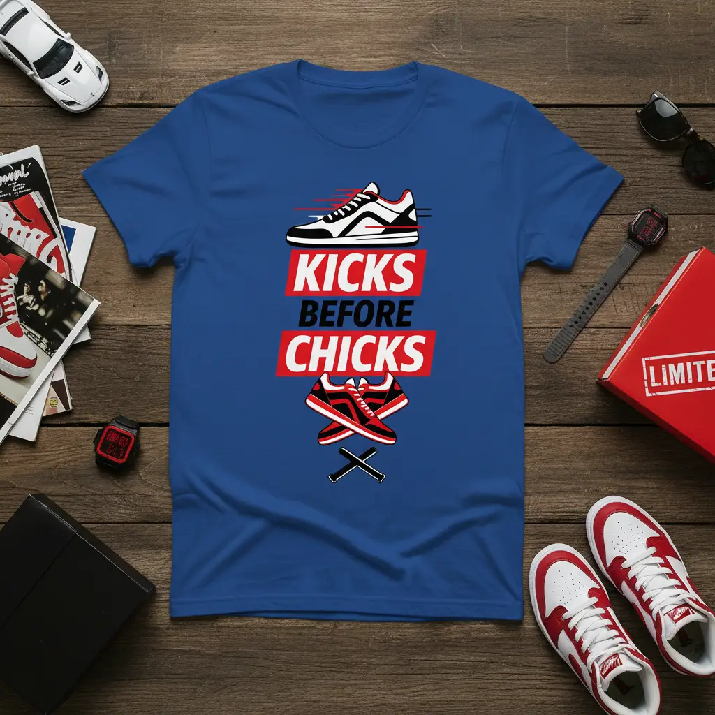 Choose from a selection of classic and vibrant colors that complement the bold graphic. Available in Black, Red, Navy, White, Dark Heather, and Royal, you can select the shade that best matches your personal style or your favorite pair of kicks. Each color is chosen to make the “Kicks Before Chicks” design pop and stand out.