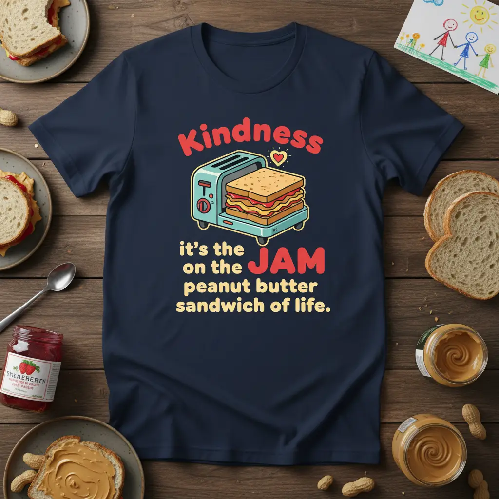 This phrase encapsulates a beautiful philosophy, suggesting that kindness is the key ingredient that elevates everyday experiences. It highlights the sweet and satisfying nature of being kind, much like the delightful combination of jam and peanut butter on a sandwich. The design playfully illustrates this concept with a vibrant graphic, making it an eye-catching and conversation-starting piece.