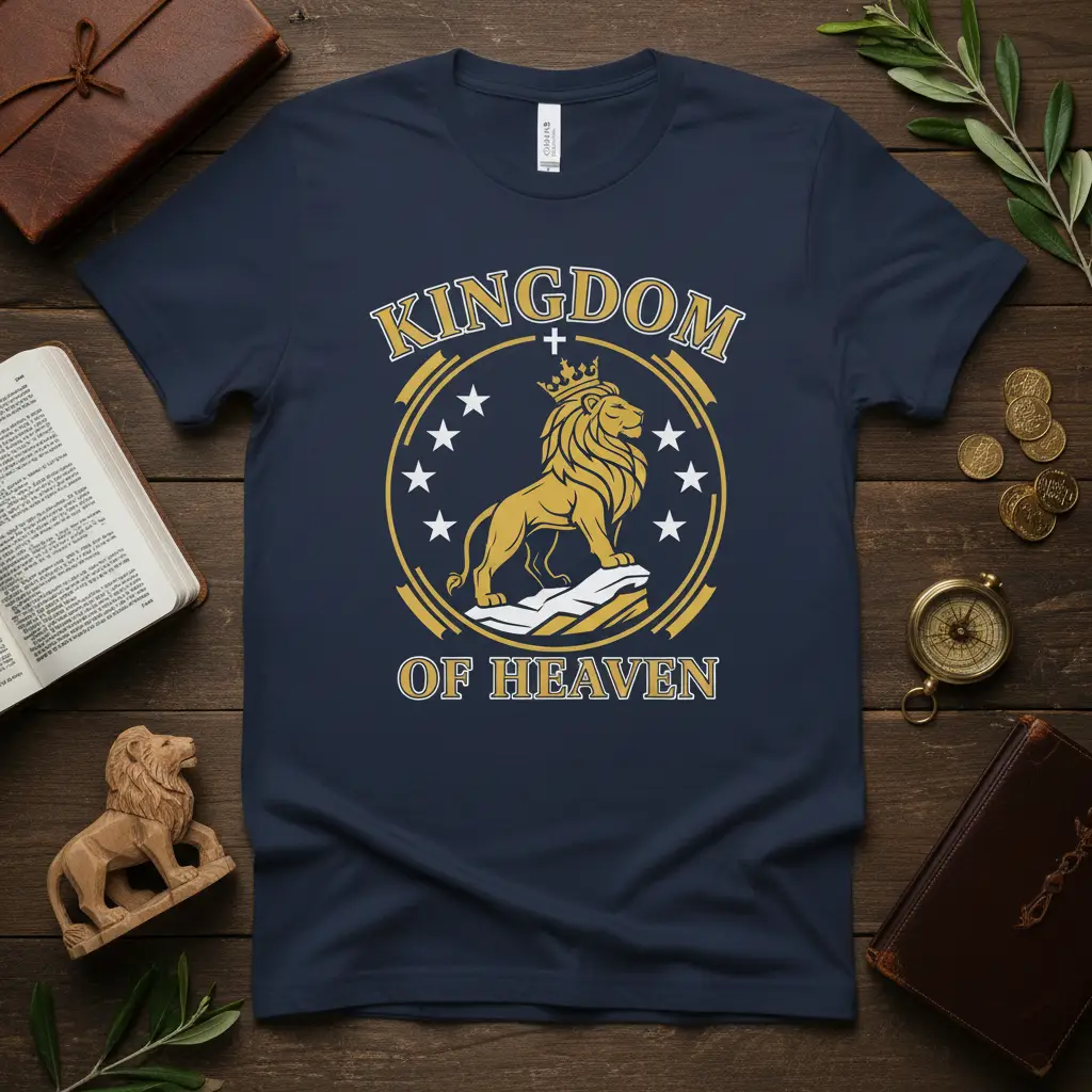 This T-Shirt proudly displays the phrase “KINGDOM OF HEAVEN” in bold, regal lettering, encircling a magnificent golden lion. The lion, adorned with a crown and standing strong on a rocky foundation, symbolizes power, courage, and the divine authority associated with the Lion of Judah. Surrounding the central motif are several stars, adding to the celestial and heavenly aura of the design. It’s an emblem of faith designed to resonate with believers who carry the spirit of the Kingdom within them.