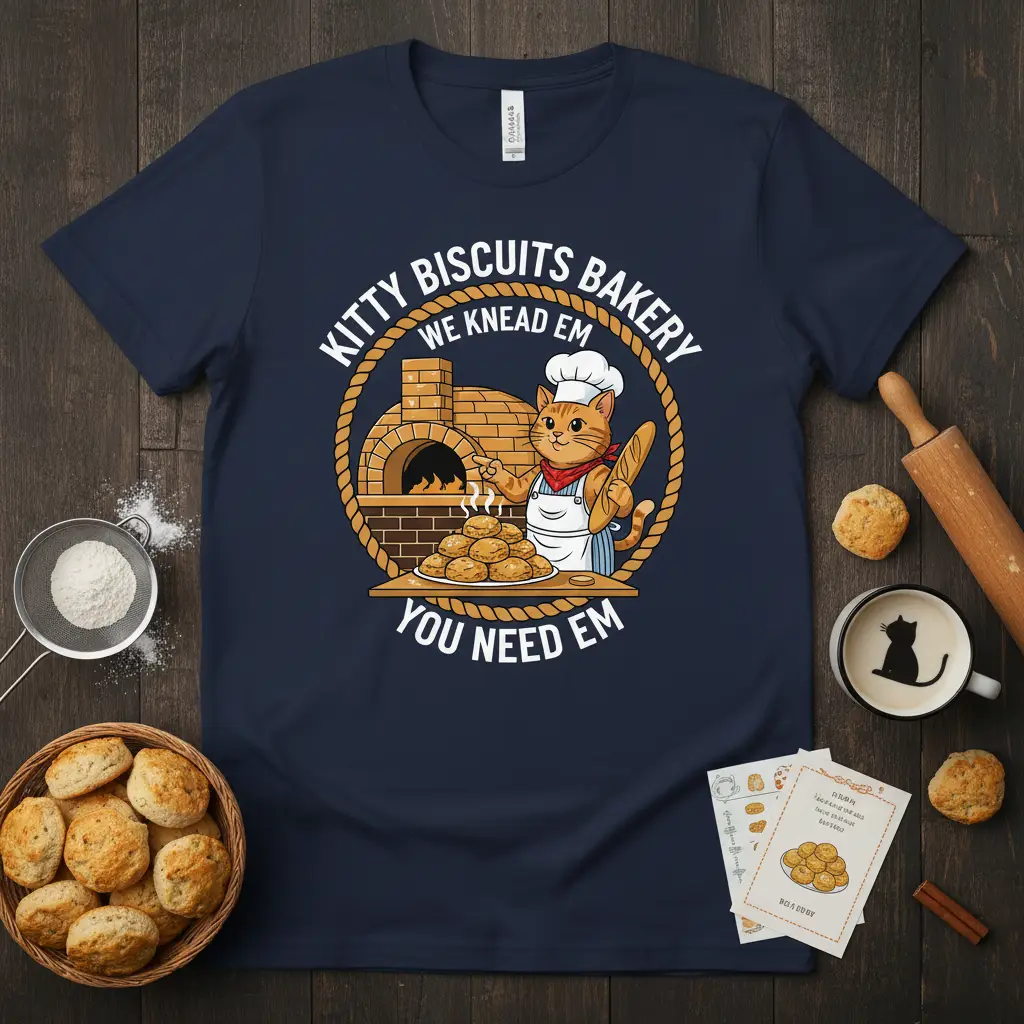 This exclusive t-shirt features the full quote, “KITTY BISCUITS BAKERY WE KNEAD EM YOU NEED EM,” presented in a fun, circular design. The central graphic depicts a cheerful orange tabby cat, complete with a baker’s hat and apron, holding a baguette. It stands proudly beside a stack of golden-brown biscuits, with a rustic brick oven in the background, implying a cozy, home-baked atmosphere. The overall aesthetic is warm, inviting, and undeniably cute.