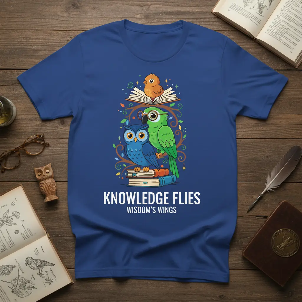 Knowledge Flies Wisdom’s Wings, this t-shirt is more than just apparel; it’s a statement of curiosity and a celebration of the lifelong journey of learning. The captivating design features an adorable blue owl and a vibrant green parrot perched atop stacks of classic books, symbolizing the foundation of wisdom. Above them, a tiny chick peeks from an open book, representing new discoveries and the continuous growth of understanding. This tee is perfect for educators, students, librarians, or anyone who cherishes the pursuit of knowledge and believes in the power of education.