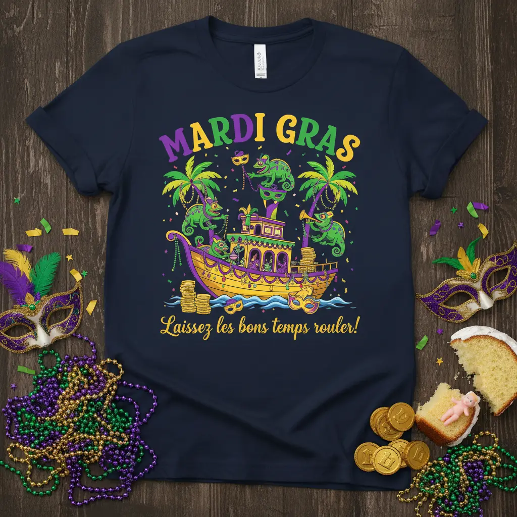 The imagery on this Mardi Gras tee is inspired by the rich cultural tapestry of Louisiana, blending iconic Mardi Gras elements with charming artistic flair. From the festive masks and beads to the lively chameleons and the grand boat, every detail is crafted to evoke the excitement of carnival season. It’s a design that resonates with the soul of New Orleans, bringing a piece of the celebration to you, no matter where you are.