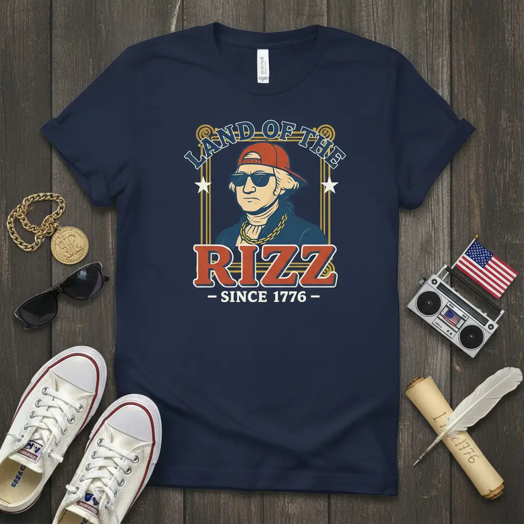 This unique design playfully reimagines George Washington, the first President of the United States, as a modern-day icon of cool. He’s sporting stylish sunglasses and a red baseball cap, complete with a prominent gold chain, embodying what we call “rizz.” The phrase “Land of the Rizz Since 1776” cleverly connects this contemporary concept to the founding year of the nation, creating a humorous and memorable graphic.