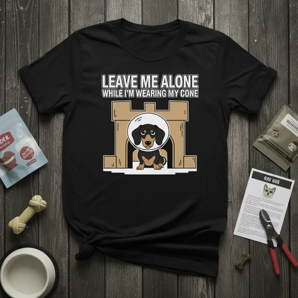 LEAVE ME ALONE WHILE I’M WEARING MY CONE text and a humorous dachshund graphic make this t-shirt a must-have for any dog owner who understands the recovery process. This design perfectly captures the sentiment of a pet who’s not feeling their best and just wants some peace. It’s a fantastic conversation starter and a great way to show off your love for your furry friend, even during their less glamorous moments. The eye-catching artwork and relatable quote are sure to bring smiles to faces.