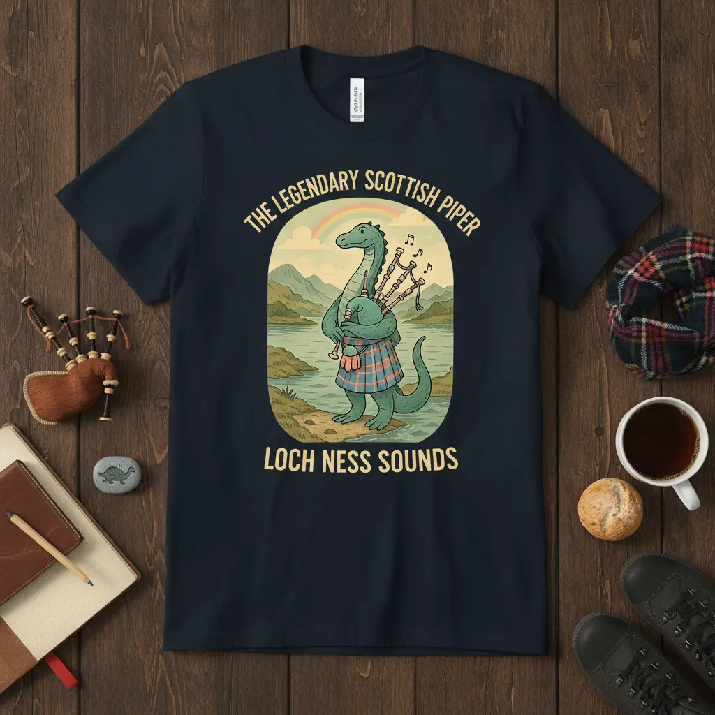 The phrase “THE LEGENDARY SCOTTISH PIPER” arches gracefully above the artwork, setting the stage for the unique theme. Below the charming depiction of Nessie, the text “LOCH NESS SOUNDS” delivers a clever and memorable punchline. This combination of imagery and text makes it an instantly recognizable and conversation-starting piece of apparel.