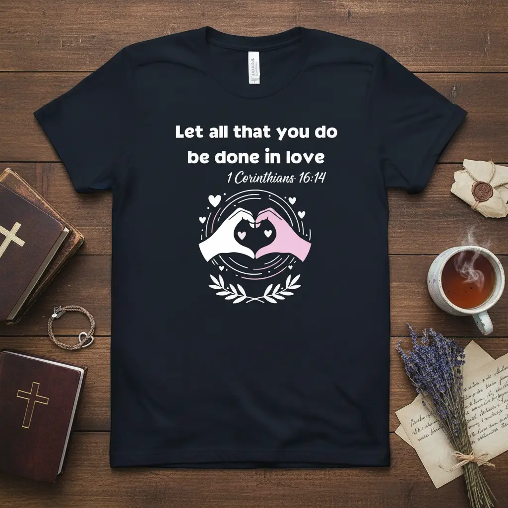 The essence of this t-shirt lies in the profound simplicity of its message, drawn from the Holy Scriptures. The verse from 1 Corinthians 16:14 encapsulates a fundamental tenet of Christian living: that love should be the driving force behind all our endeavors. This sentiment is beautifully represented through the elegant typography and the symbolic imagery of hands forming a heart.