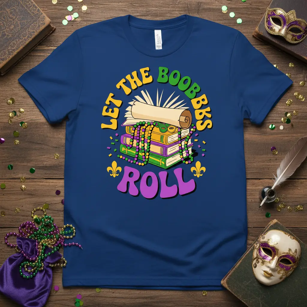 LET THE BOOBBS ROLL on this unique and festive t-shirt, designed for those who appreciate a good book and a good time. This tee perfectly captures the spirit of Mardi Gras with a playful twist, making it an ideal choice for parties, casual outings, or simply lounging with your favorite novel. The vibrant colors and eye-catching design ensure you’ll stand out in any crowd. It’s more than just a shirt; it’s a statement piece that combines your passions with celebratory flair. Get ready to embrace the fun and let the good times—and the books—flow!