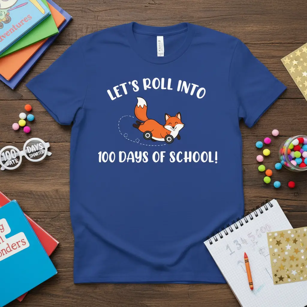 This adorable “Let’s roll into 100 days of school!” t-shirt is perfect for celebrating a major milestone. Featuring a cute rolling fox graphic, it’s a fun way for students and teachers to show off their school spirit. Made with comfortable, quality fabric, it’s ideal for daily wear or special school events.