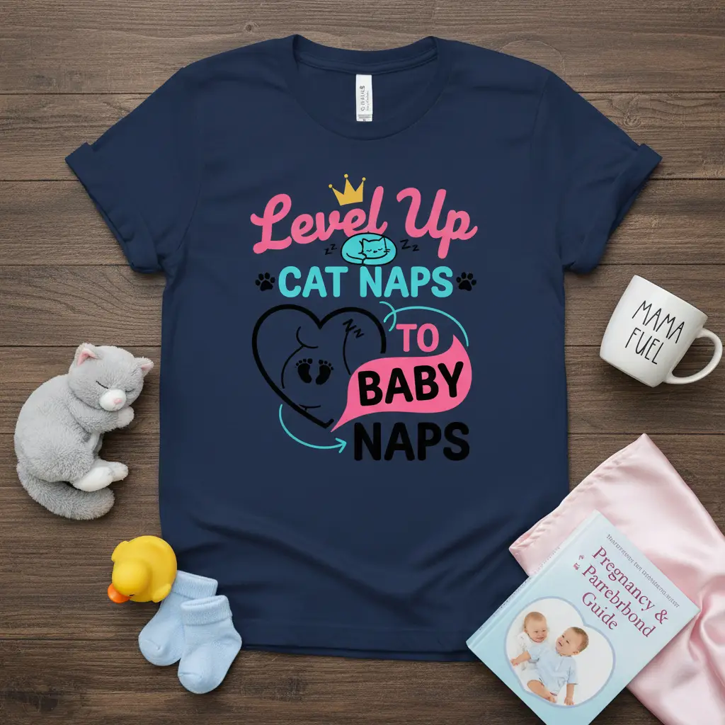Level Up Cat Naps to Baby Naps is more than just a phrase; it’s a relatable anthem for new parents and soon-to-be moms everywhere. This t-shirt perfectly captures the humorous transition from the relatively peaceful slumber of cat naps to the all-encompassing world of baby naps. It’s designed for those who understand that sleep becomes a precious commodity, celebrated in any form it takes. The playful graphics and witty text make this tee a conversation starter and a badge of honor for anyone navigating the beautiful chaos of early parenthood. Show off your journey with pride and a smile.