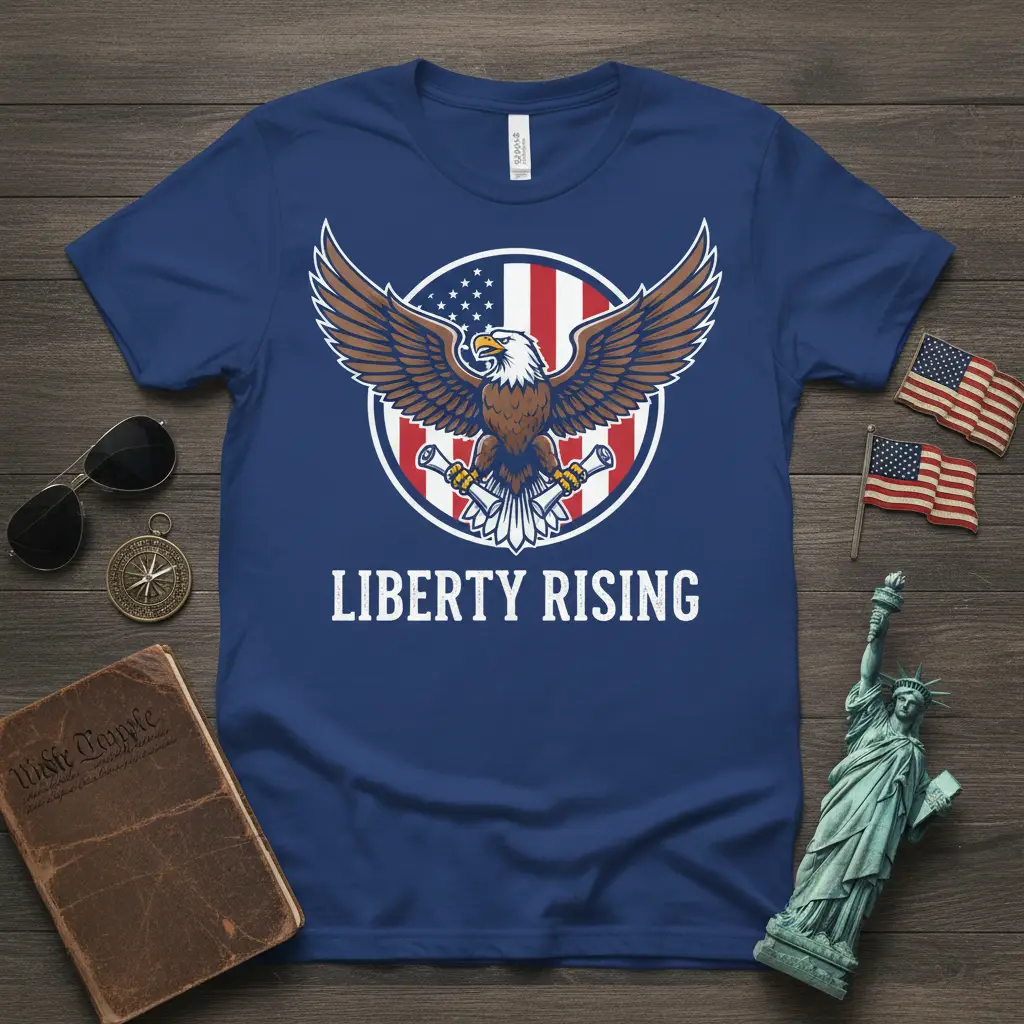 Pick from Black, Navy, Royal, Dark Heather, Red, and White to match your mood and wardrobe staples. Each colorway keeps the LIBERTY RISING design clear and photo-ready for everyday wear.